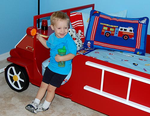His dad made him a “Big Boy Bed” like a fire engine for his birthday. Yes, I mean that his dad made it all by himself. What talent! You might enjoy this photo that I made when Drew first saw the bed.