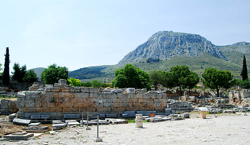 Our photo shows the “judgment seat” (Greek, bema) in the agora (marketplace) at Corinth. The Acrocorinth is the mountain in the background. The Temple of Aphrodite stood on the Acrocorinth in New Testament times.