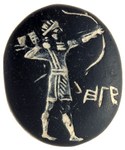 The seal was sent for expert evaluation to Professor Benjamin Sass of the Tel Aviv University and Dr. Tali Ornan of the Hebrew University of Jerusalem. According to them the image of the archer was influenced by Assyrian wall reliefs in which archers are portrayed shooting bows and arrows – such as those that are known from the Lachish relief. The image of the archer appears in profile: he is standing in a firing position with his right foot in front of his left. His face is portrayed schematically but his body, his dress and especially the muscles of his arms and legs stand out prominently. He is barefoot. His attire includes a headband and a skirt that is wrapped around his hips. A quiver hangs from his back and its straps are drawn tightly across his exposed chest. He is holding a bow and arrow in his hands. His right hand is extended forward holding the bow while his left is pulled back grasping the arrow. The seal is quite unique since this is the first time that a private seal has been discovered that bears a Hebrew name and is decorated in the Assyrian style. The seal attests to the strong Assyrian influence that existed in Jerusalem in the seventh century BCE. It is usually assumed that the owner of private seals were individuals who held government positions. We can suggest that the owner of the seal – Hagab, who chose to portray himself as a Hebrew archer depicted in the Assyrian style – served in a senior military role in Judah.