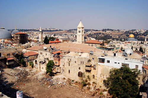 The view from the hotel roof is good. To the left is the dome of the Holy Sepulchre. The Lutheran Church tower is in the middle of the photo. The Dome of the Rock is visible to the right. In the distant left is Mount Scopus. To the right is the Mount of Olives.