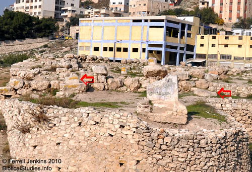 The stone bases on either side of the entrance to the temple are visible today, and marked here by the red arrows. The base on the left has the broken sacred standing stone in place.