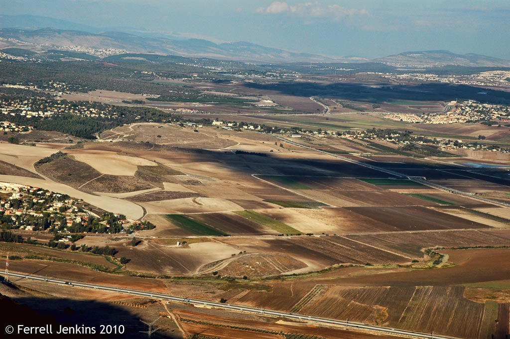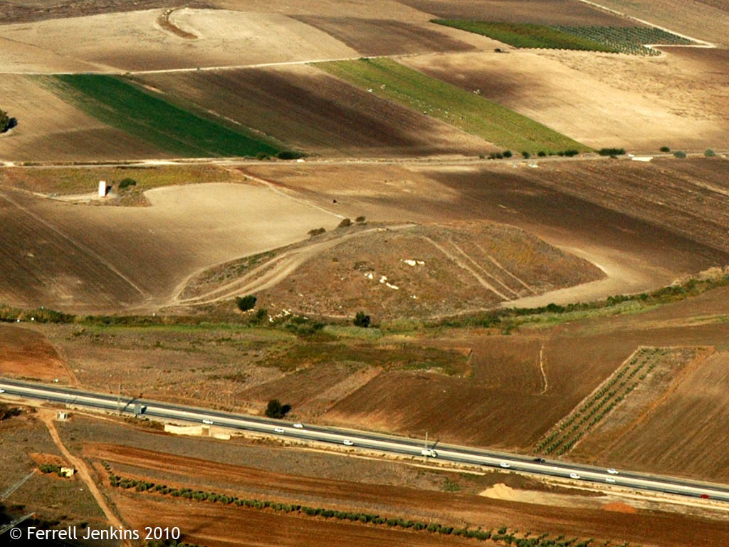 Those who have visited the site of Murakah on Mount Carmel have seen this tell and the Kishon River in the Jezreel Valley. The photo below shows the eastern end of the Jezreel Valley. The tell is in the center of the photo at the bottom. You can make out the line of the Kishon River below the tell. The dark areas in the photo are shadows of passing clouds. Click for a larger image.