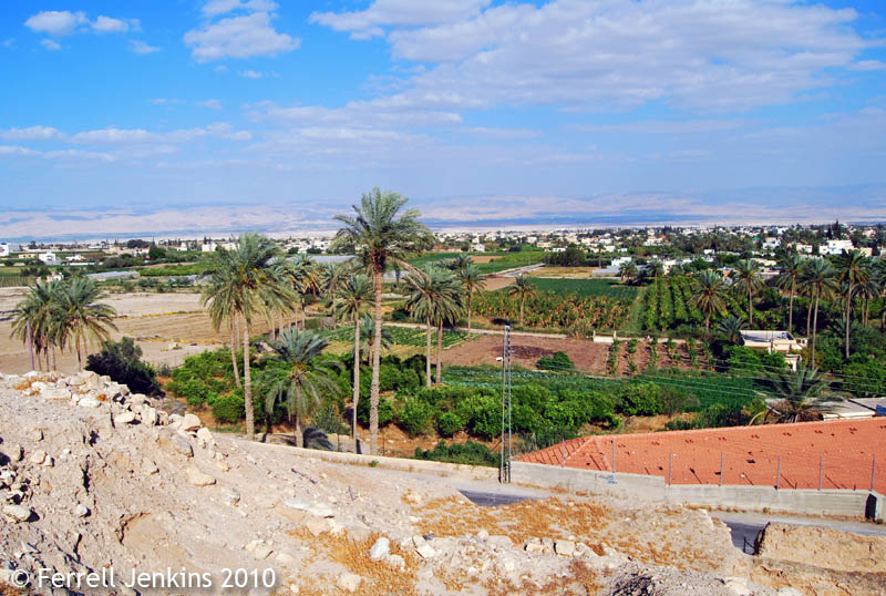 Jericho is still a city of palm trees (Deuteronomy 34:3). Below the ancient mound (Tell es-Sultan) to the east there is a spring called Elisha’s Fountain. The photo above was made from the tell with a view to the east. The mountains of Transjordan can be seen in the distance. Close to the tell there is a building with a red tile roof. This is the pumping station that provides water for modern Jericho. The next photo shows the spring as it exits the ground [at the present time]. Perhaps this is the same spring mentioned in the Bible.