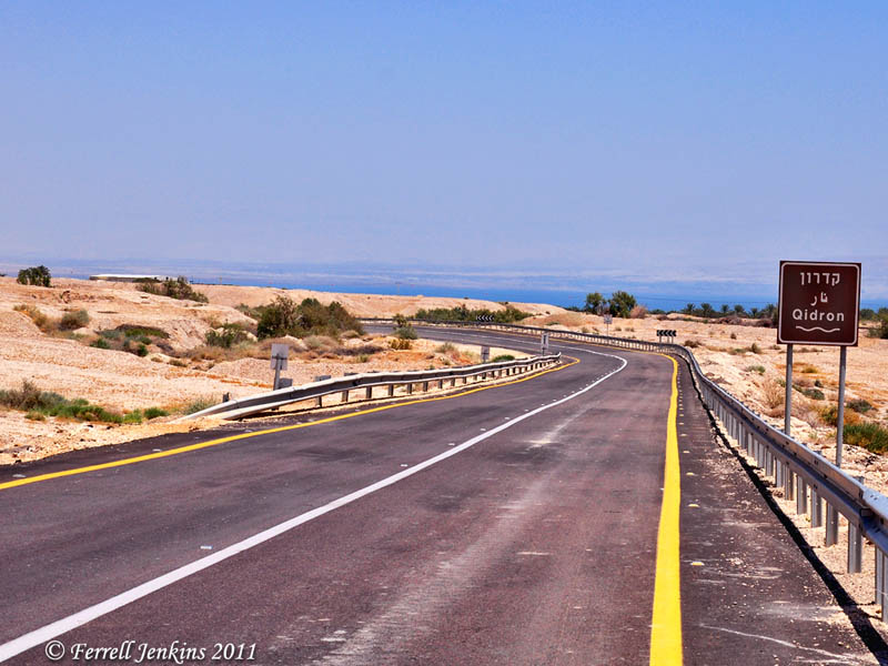 The photo below was made about 4.25 miles south of Qumran along the Dead Sea Road (Hwy. 90) as it crosses the brook Kidron (Qidron). The Christmas Cave mentioned in the article is to the west (left) of the highway as the brook comes down from Jerusalem. (Click on the photo for a larger image.)