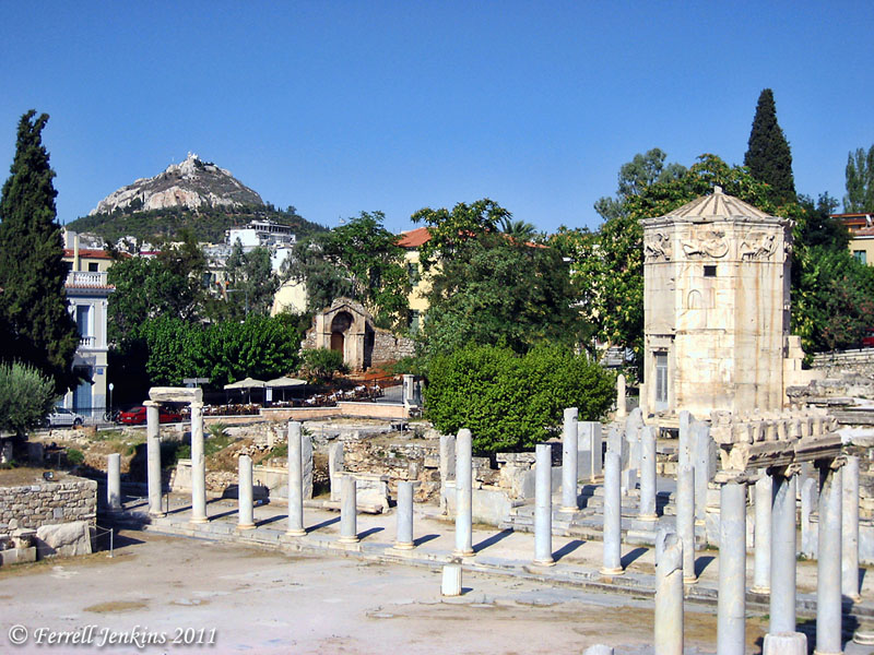 Tower of the Wind in Roman Forum. Mt. Lycabetus in distance. Photo by Ferrell Jenkins.