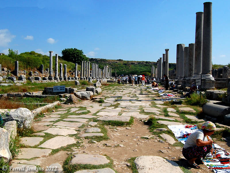 The photo below is one I made at Sardis earlier this month. The view is West over the ruins of the Temple of Artemis. One of the Ionic capitals is in the Metropolitan Museum in New York. The temple dates back to at least the 6th century B.C., but was destroyed in 499 B.C., and then underwent three rebuilding phases. The columns seen here date to the third rebuilding phase (ca. A.D. 150). Ruins of a restored Byzantine church from the fourth century A.D. may be seen in the left corner of the photo.