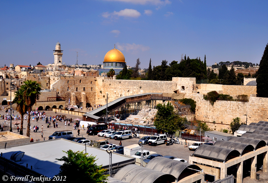 This photo of the Western Wall and Temple Mount platform was made from the southwest. You can see a portion of the Western Wall, the Mughrabi (temporary) Bridge, and the Dome of the Rock (where the biblical Temple once stood).