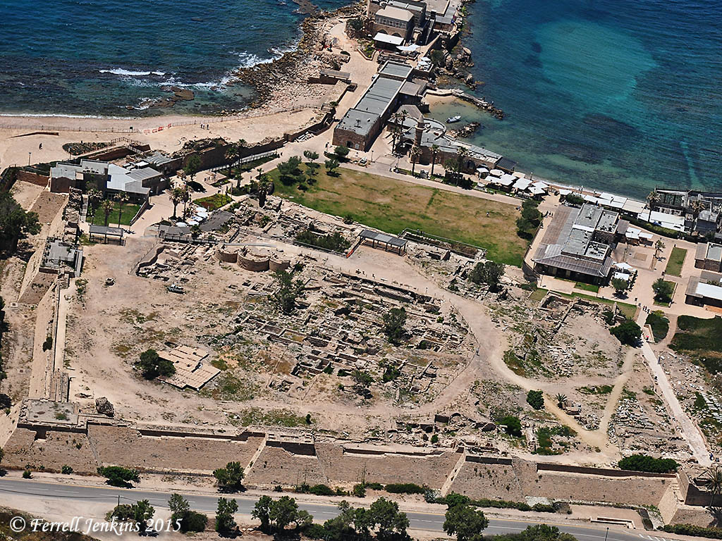 Aerial view of Caesarea Maritima showing the area of the Byzantine church ruins. The view also shows the Crusader wall. Photo by Ferrell Jenkins.