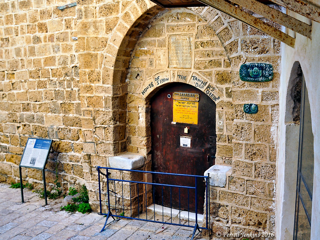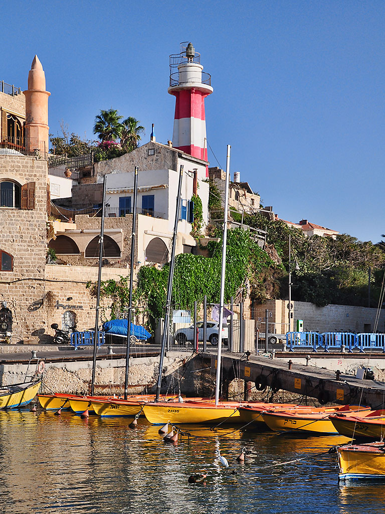 The harbor at Joppa/Jaffa/Yafo was once a much more significant harbor, but never an adequate one. Only a small leisure harbor remains today. Our late afternoon photo shows the lighthouse rising above some of the buildings of the city.