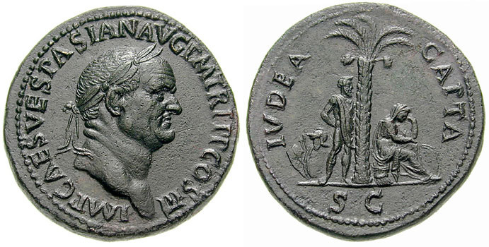 Vespasiano_Sesterius_Iudaea_Capta-RIC_0424. From Wikimedia Commons.