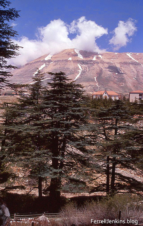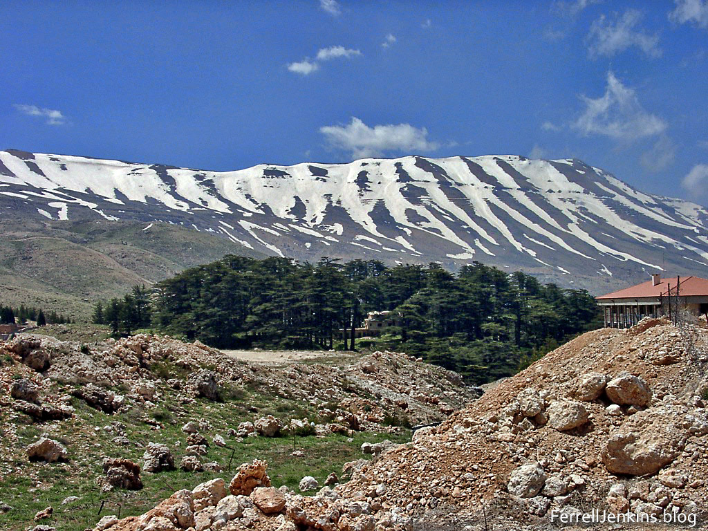 Only a few of the fabled cedars remain in Lebanon. One cluster of trees grow at Besharre in the north of Lebanon at an elevation of about 5000 feet or more above sea level. Our photo below was made in May, 2002, when there was some snow still on the surrounding mountains.