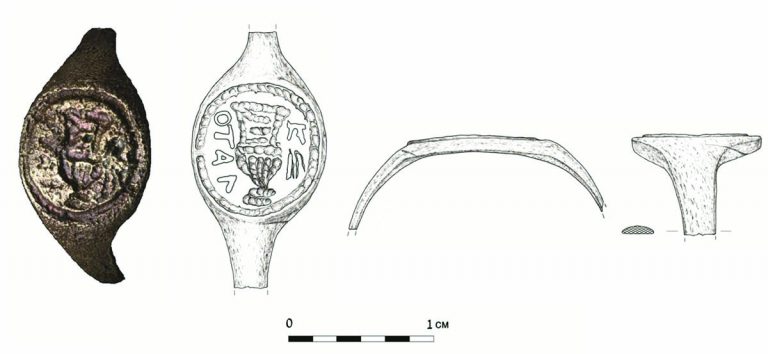 This ring was found by Hebrew University professor Gideon Foerster during an excavation at the Herodium in 1968-9. Only now have scholars at Hebrew University been able to use modern photographic technology to read the inscription on the ring. The thin ring made of copper-alloy shows a krater with a Greek inscription around it. It reminds one of an ancient coin set in a ring. The krater was often used for mixing wine.