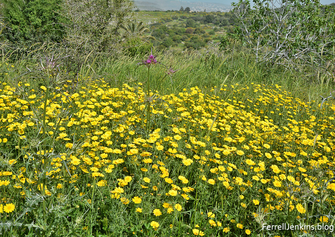 For millennia olives have been so important in Israel and the West Bank that we see ancient crushing installations at various places we visit. Some of the presses are in small museums. I was impressed with the installation in the park at Neot Kedumim. At a distance it had an idyllic look.