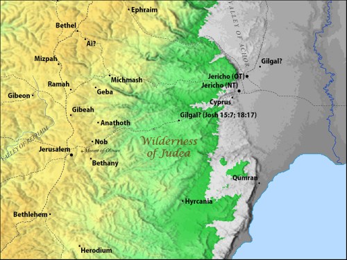 The wilderness of Judea stretches from the eastern slope of the central mountain range to the Jordan River. Of course, it extends much farther south along the Dead Sea.