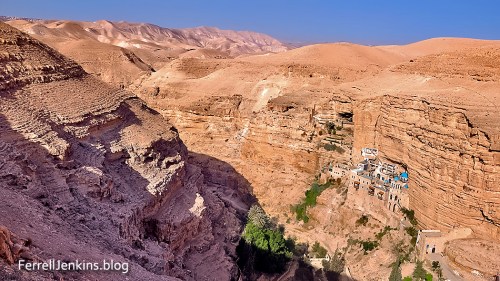 The Saint George monastery hangs along a cleft in the wilderness of Judea where the Wadi Kelt runs from near Jerusalem past Jericho. Notice the beautiful color shades here. Photo by Ferrell Jenkins.