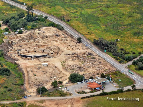 Aerial view of Bet Guvrin (Eleutheropolis). The amphitheater is located at the bottom of the left top corner of the photo. Highway 35 is on the right. Some ruins of Eleutheropolis can be seen on the south side (right) of the highway. If you have traveled in this area you may have stopped at the small gas station for a snack or a bite of lunch. The small road in the upper right corner leads to the entry to Maresha and the caves. Photo by Ferrell Jenkins in April, 2016.