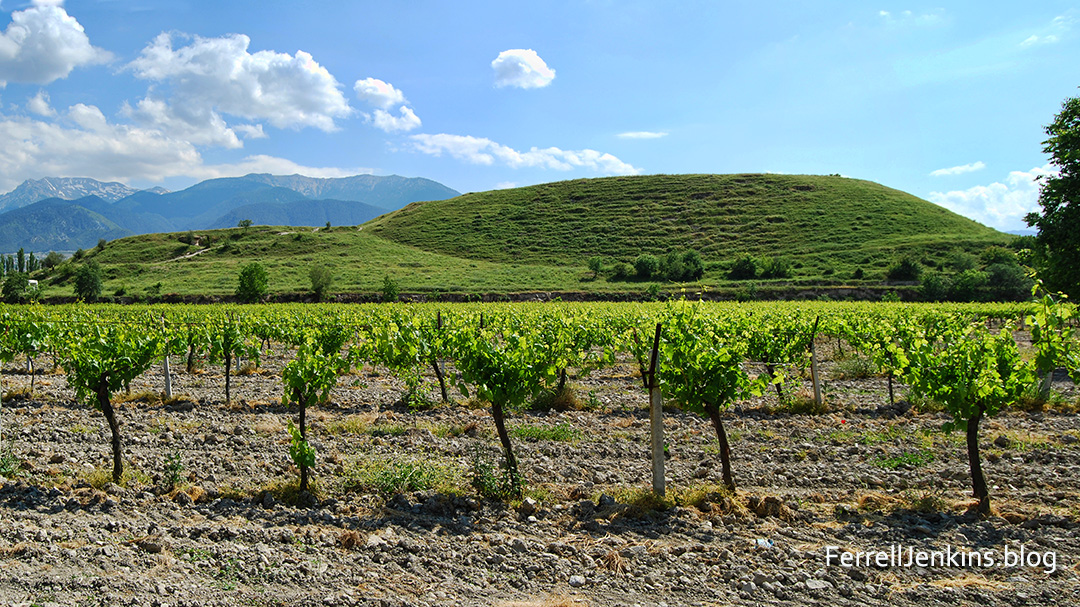 Between the vineyard in the foreground and the mound there is a a little black line. Hidden there is the small Lycus River flowing west (to the right).