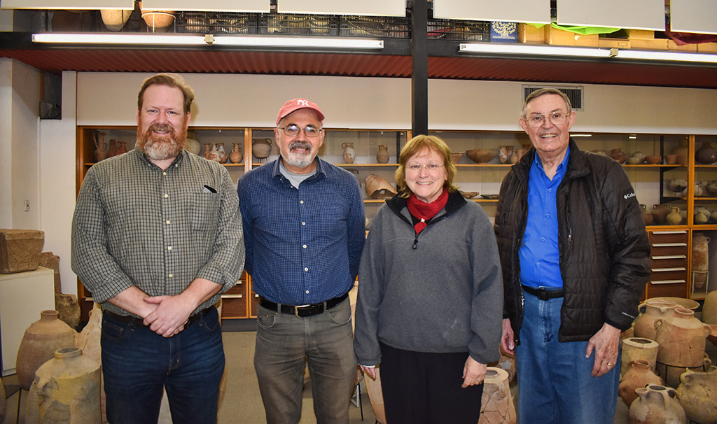 From left to right, Luke Chandler, Dr. Yosef Garfinkle, Dr. Eilat Mazar, and Ferrell Jenkins in the archaeology lab at the Hebrew University of Jerusalem.