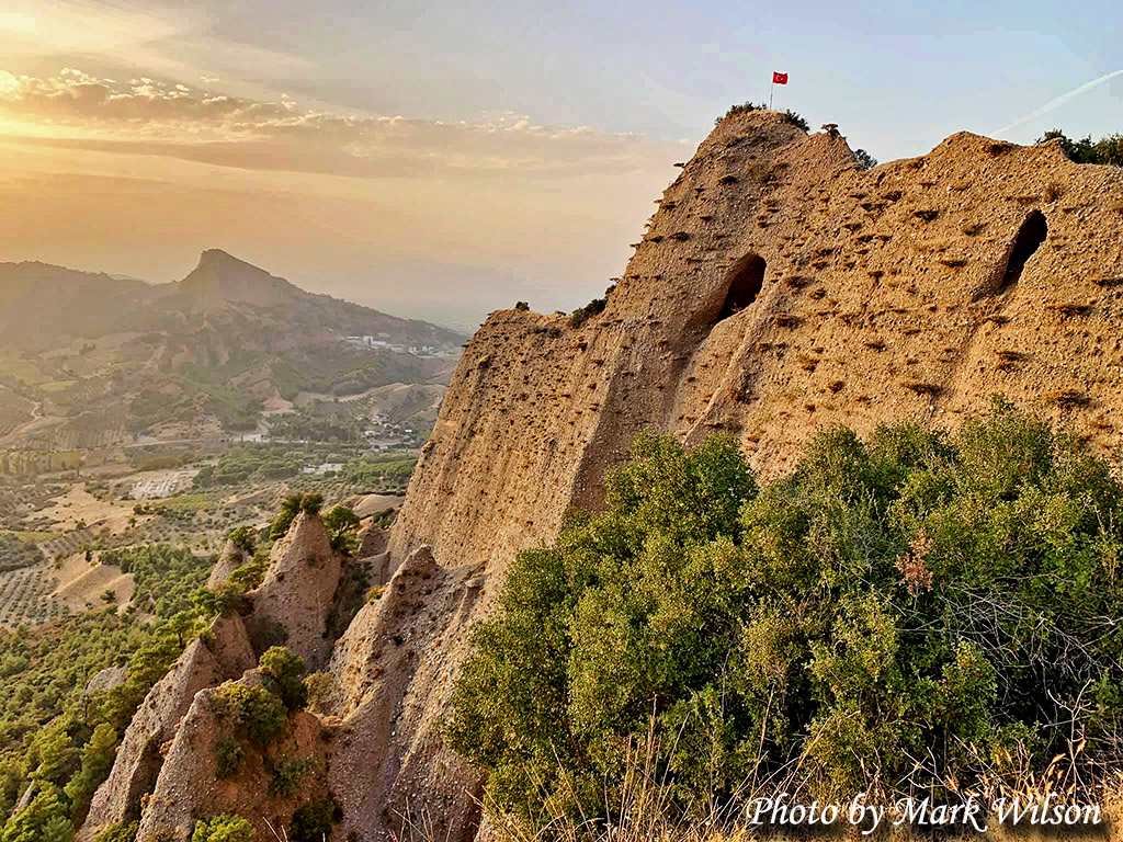 The citadel of Sardis was built on Mount Tmolus, but the rock naturally flaked off and did not provide a firm foundation for the walls. Our photo was made in the late afternoon before sunset by Dr. Mark Wilson, author of Biblical Turkey, in October, 2020. Photo used by permission.