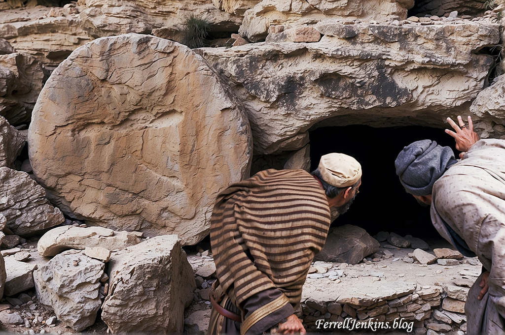 [The second photo showing the disciples of Jesus at the open tomb was made in Leonardo AI. David Padfield assisted me in this project.