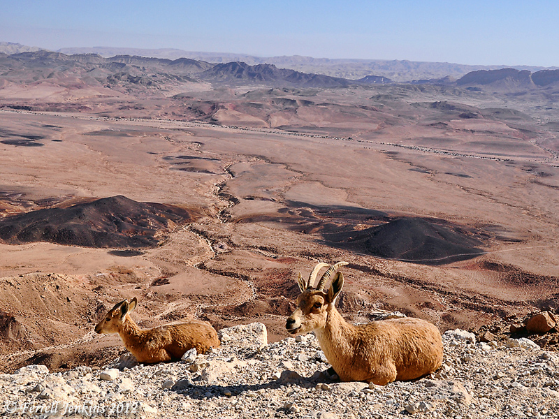 Ibex enjoy the view at Mitzpe Ramon, Israel, in the Wilderness of Zin. These two Ibex are lying on the edge of a steep cliff over a major highway below. Use the blog Search box to locate more photos of Ibex and additional information. Photo by Ferrell Jenkins.