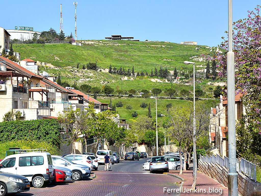 This is a modern view of Tall al Ful (formerly called Tell el-Ful) from the west side town of Pisgat Ze’ev Mizrah. Notice the structure on top of the mound. Explanation below.