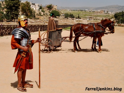 There is a wonderful performance in the early second century A.D. hippodrome at Jerash, Jordan. The RACE show (Roman Army Chariot Experience) shows actors dressed as Roman soldiers performing various activities of the early soldiers. Our photo shows a Roman centurion from that show.