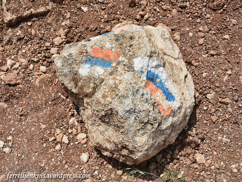 The Israel National Trail crosses the new road. The white, blue, and orange stripes mark this trail all over the country. Photo by Ferrell Jenkins.